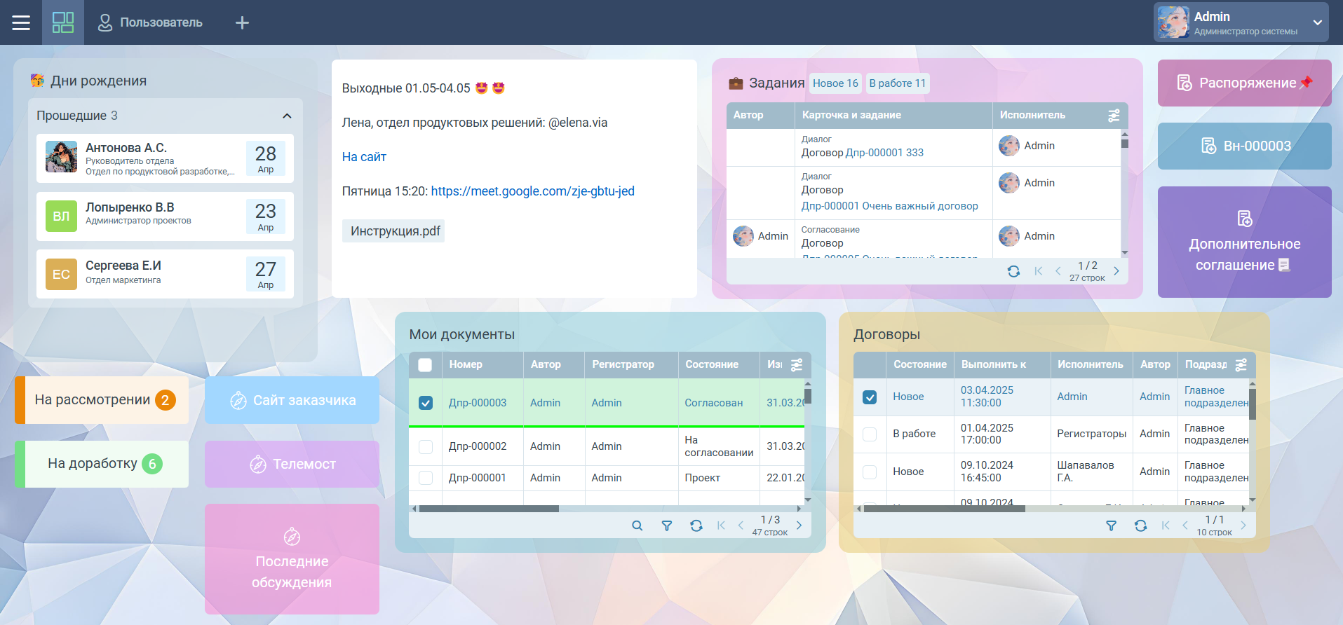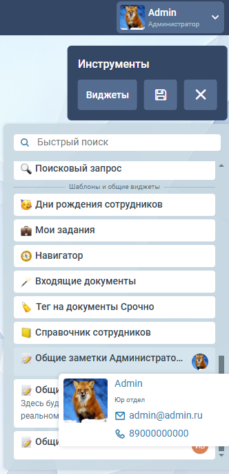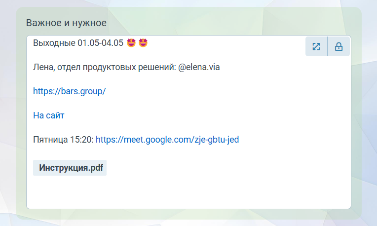 Вывести на дашборд любую нужную информацию: напоминание о встрече, важные контактные данные, ссылки, документы и файлы, которые должны всегда оставаться под рукой - можно в виде личных заметок. Что важно, данные из него видит только текущий пользователь и никто более, включая даже администраторов системы.