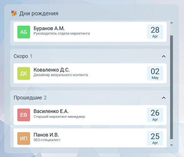 Оставайтесь в курсе дней рождения сотрудников: как сегодняшних, так и прошедших с предстоящими. При наведении указателя мыши на сотрудника появится дополнительная информация с его контактами.