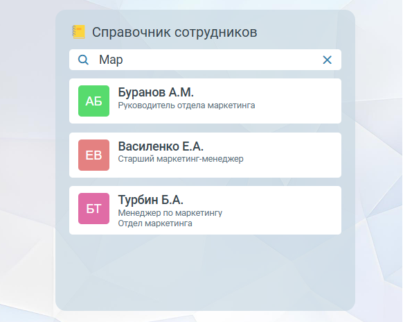 Уточнить ФИО любого сотрудника, его должность, найти контактные данные сотрудников из своего или другого подразделения и быстро с ними связаться можно при помощи виджета “Справочник сотрудников”.