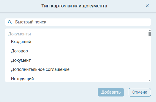 Пользователь может выбрать только те типы карточек, доступ к созданию которых у него есть в системе.