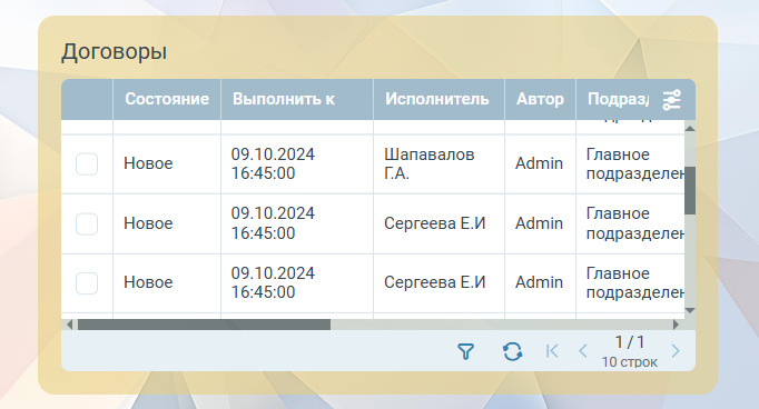 Виджет “Представление” выведет на дашборд любое доступное вам представление, при этом, прямо из виджета можно воспользоваться всеми функциями представления: отсортировать и отфильтровать данные, изменить порядок и состав колонок, скрыть ненужные.