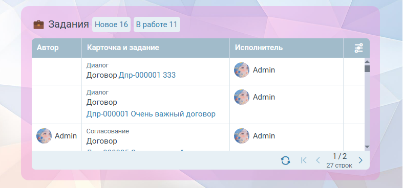 Эффективно планируйте своё время с виджетом “Мои задания”, который отображает текущие задания пользователя, позволяя отслеживать количество новых заданий и тех, что уже взяты в работу. Настроить виджет можно так же, как и виджет “Представление”, воспользовавшись функциями фильтрации данных, их сортировки и т.д.
