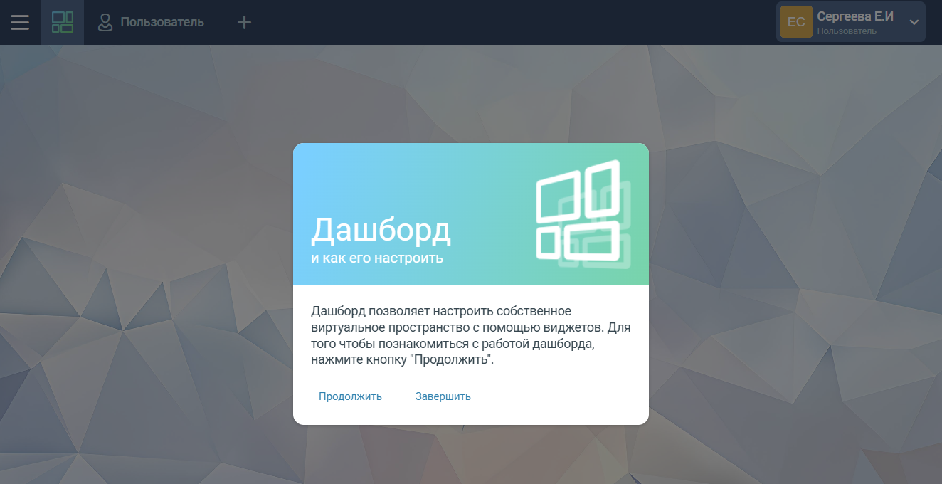 Открывая дашборд впервые, вы получите возможность пройти интерактивное обучение, благодаря которому быстро и просто сможете настроить личный дашборд с набором необходимых виджетов.