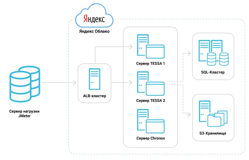 - Сервер генерации нагрузки: JMeter на 12-ядерном процессоре с 48 ГБ RAM
